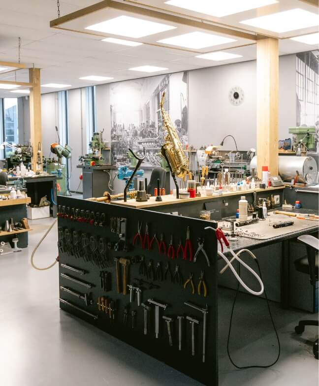 We hebben enkele speciale machines in ons atelier die polijsten met nauwkeurige precisie kunnen uitvoeren. Daarnaast polijsten elk onderdeel van het blaasinstrument zorgvuldig met de hand. Ons doel is om een uniforme, glanzende afwerking te creëren die het instrument er als nieuw uit laat zien.