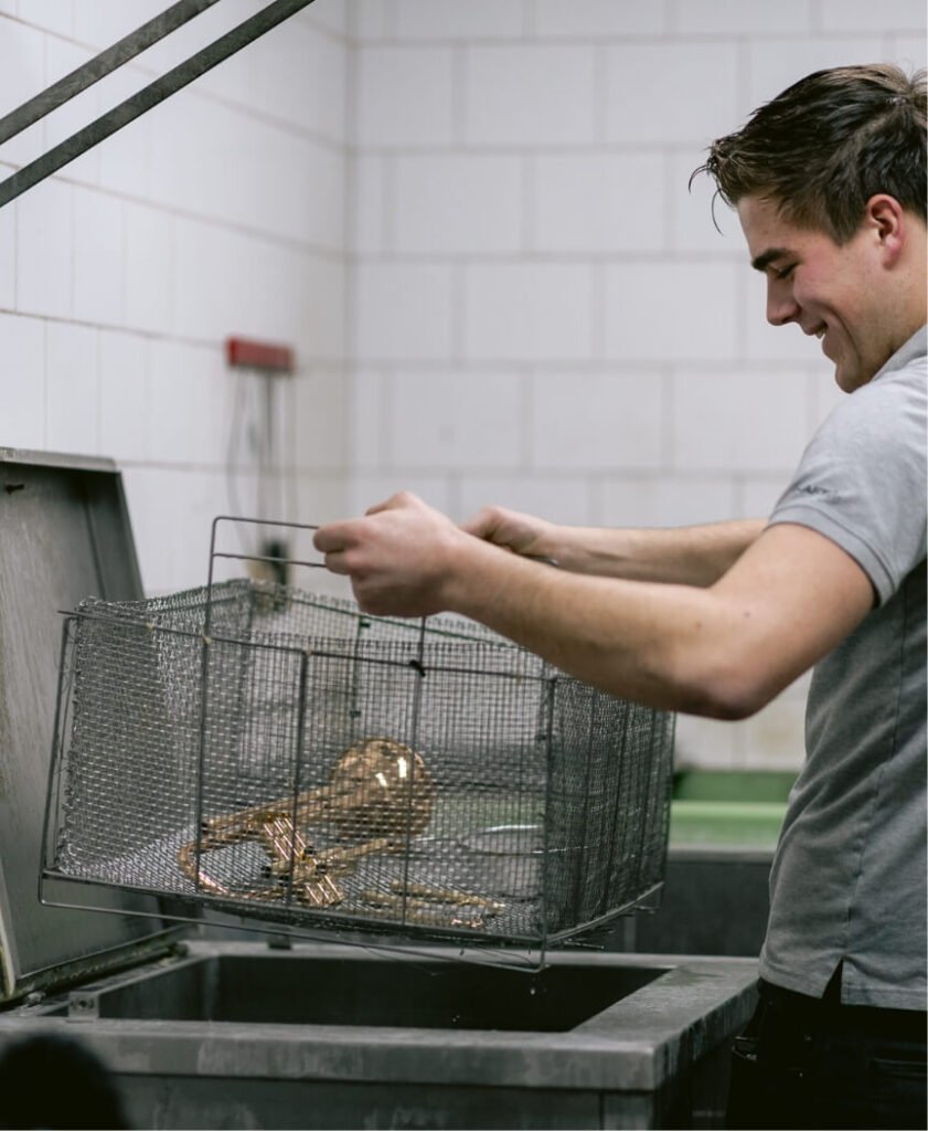 Zit er bijvoorbeeld een flinke deuk in de bekerrand? Dan beginnen we met het uitwrijven van de rand met de hand. Vervolgens rollen we de trompet op een mal. Onze aanpak omvat het gebruik van speciale gereedschappen en methoden om de beschadigingen nauwkeurig en gelijkmatig te herstellen, met minimale verstoring van de originele vorm en structuur van het instrument. Na het uitdeuken voeren we indien nodig aanvullende afwerkingen uit om het instrument weer in optimale staat te brengen.