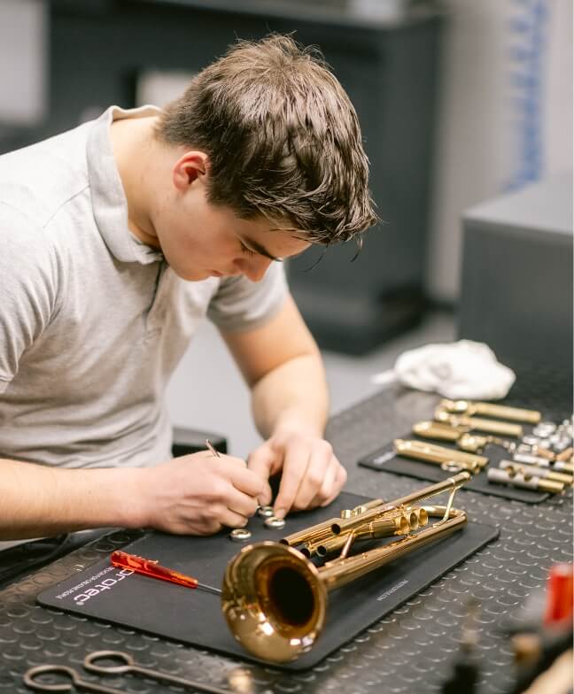 – Testen en afstellen: We testen de trompet grondig na montage om ervoor te zorgen dat alle onderdelen correct zijn geïnstalleerd en goed functioneren, en stellen indien nodig de speeleigenschappen af voor een optimale speelbaarheid en geluidskwaliteit.